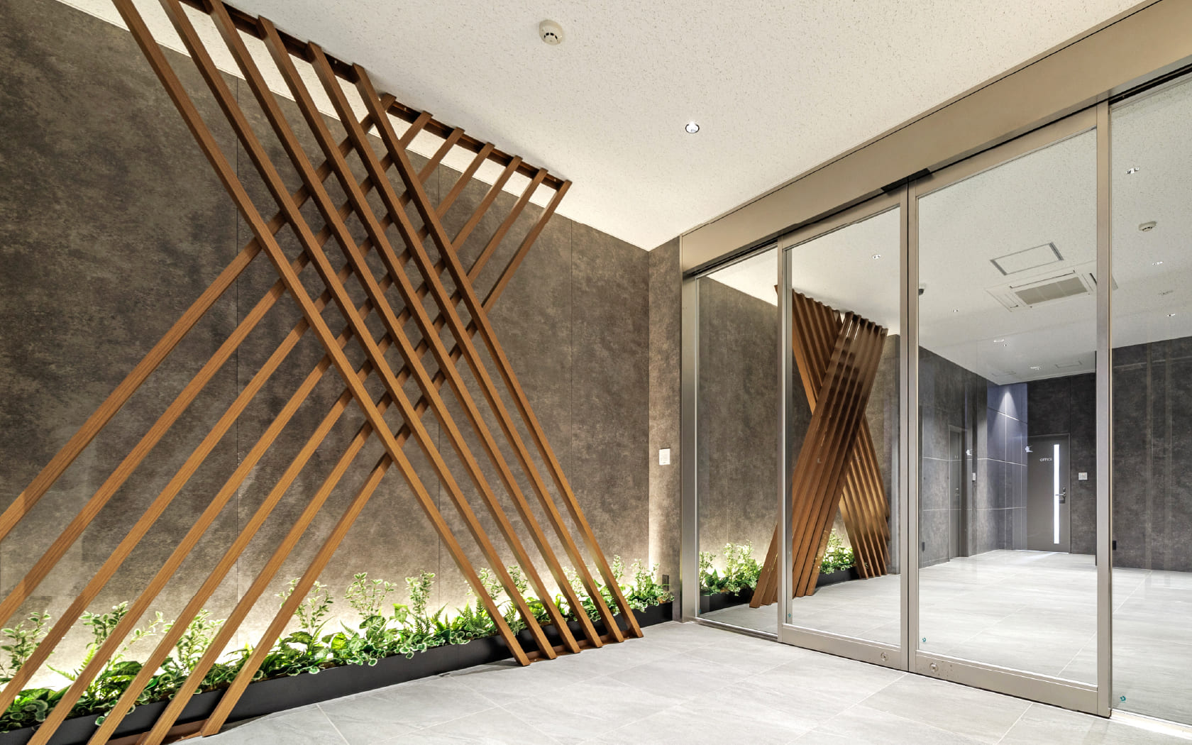 シンプルでありながら、木とグリーンをモチーフにしたデザインを取り入れることで温かみを演出しています。エントランスと風除室に連続性を持たせ一体感を感じられることで、広々とした空間になっています。