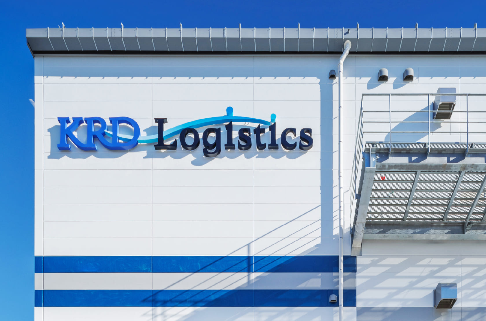 KRD-Logisticsのブランドロゴのイメージと、当社のコーポレートカラーに合わせ、ブルーを基調とした波模様を表現しており、遠くからも一目で当社の物件だと分かるような、こだわりのデザインです。