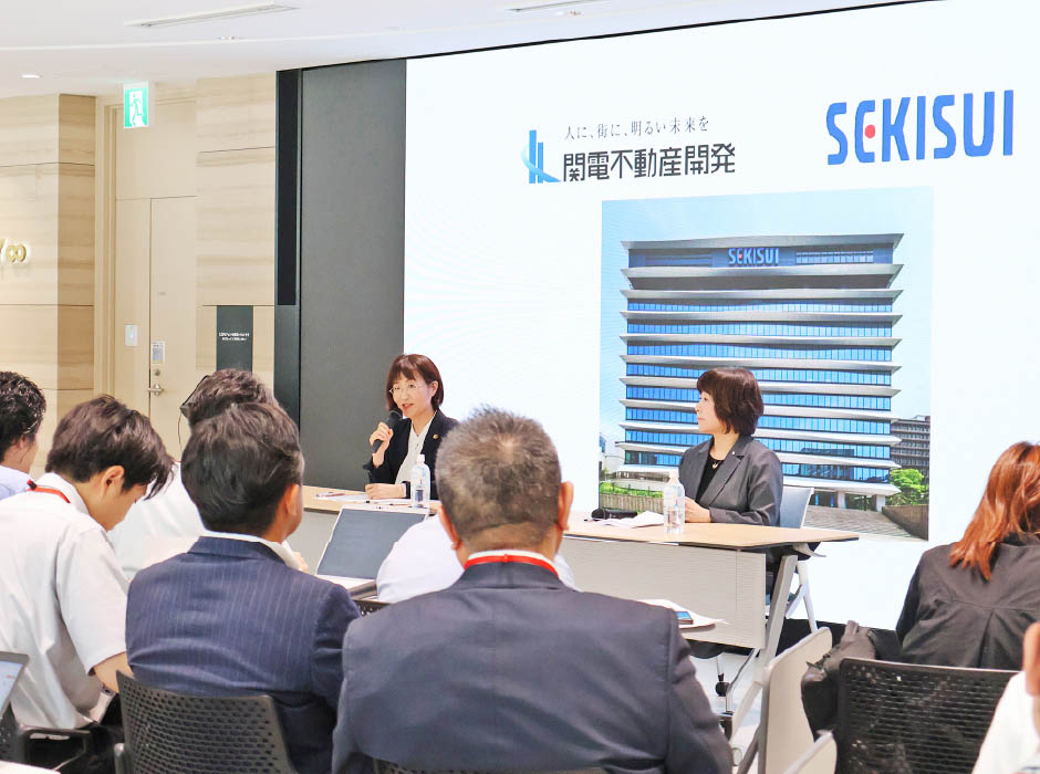 6月30日(月)、福本社長が出席し、堂島関電ビル内において積水化学工業様と合同でリニューアル工事竣工に関する記者発表会を実施しました。当日は多くのメディアの方に参加いただき、ビル内の見学を含め本プロジェクトについてアピールすることができました。