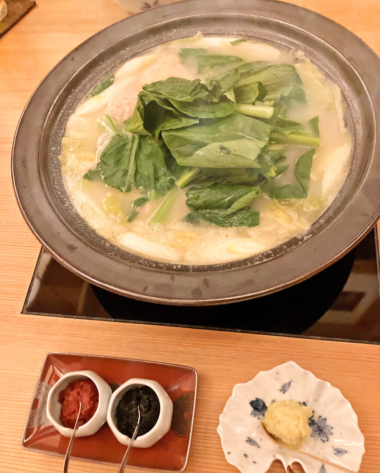 柚子胡椒を入れることが多いですが、本日のお店は柚子胡椒、生姜、辛味噌が薬味として添えられていました。