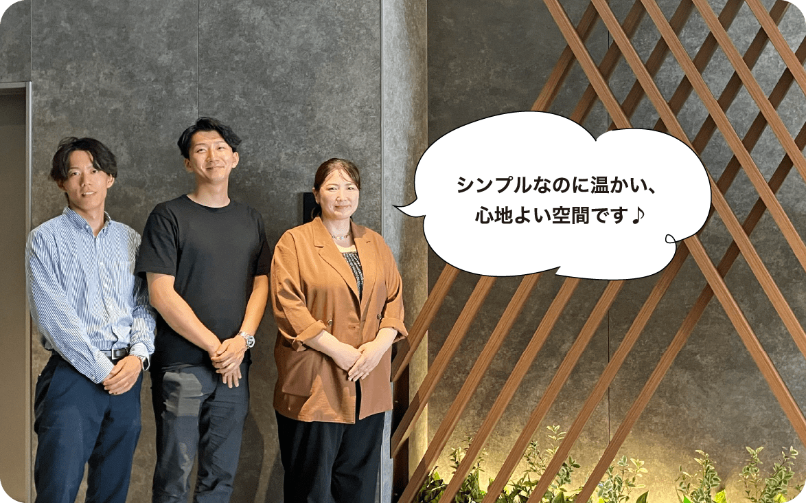 シンプルでありながら、木とグリーンをモチーフにしたデザインを取り入れることで温かみを演出しています。エントランスと風除室に連続性を持たせ一体感を感じられることで、広々とした空間になっています。