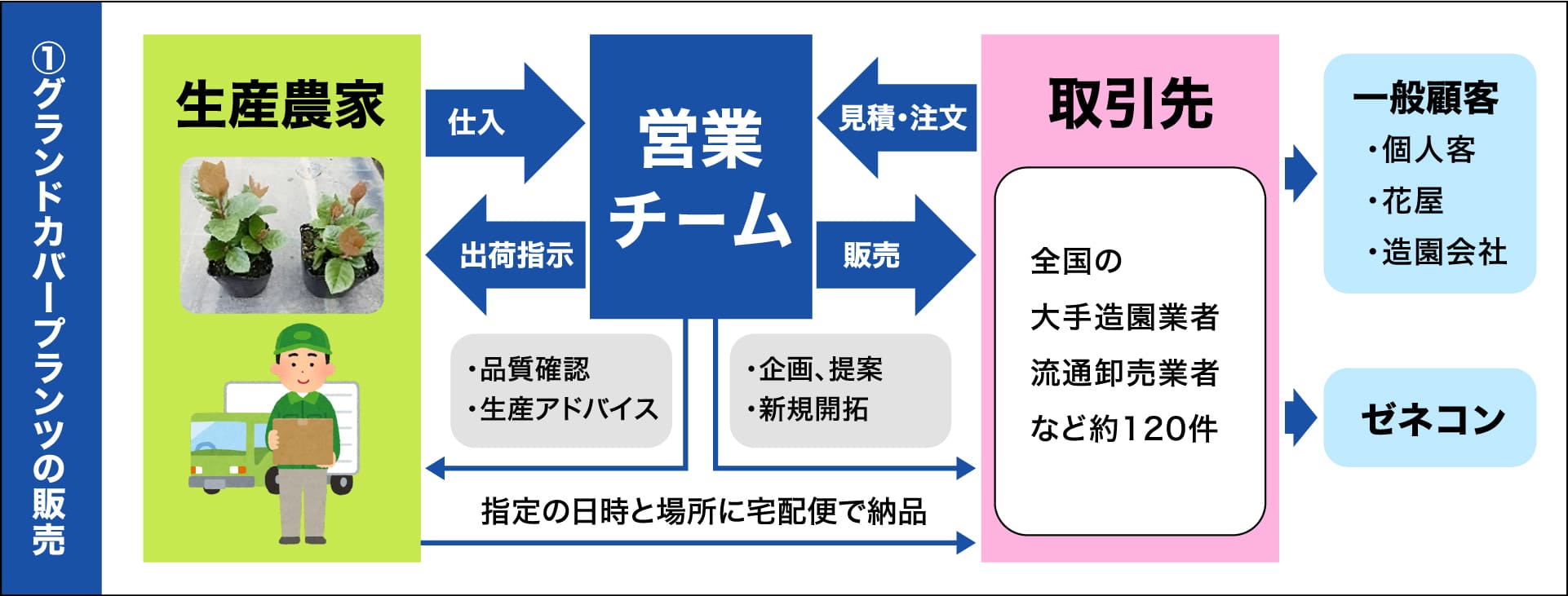 ①グランドカバープランツの販売はB to Bの卸売業です。