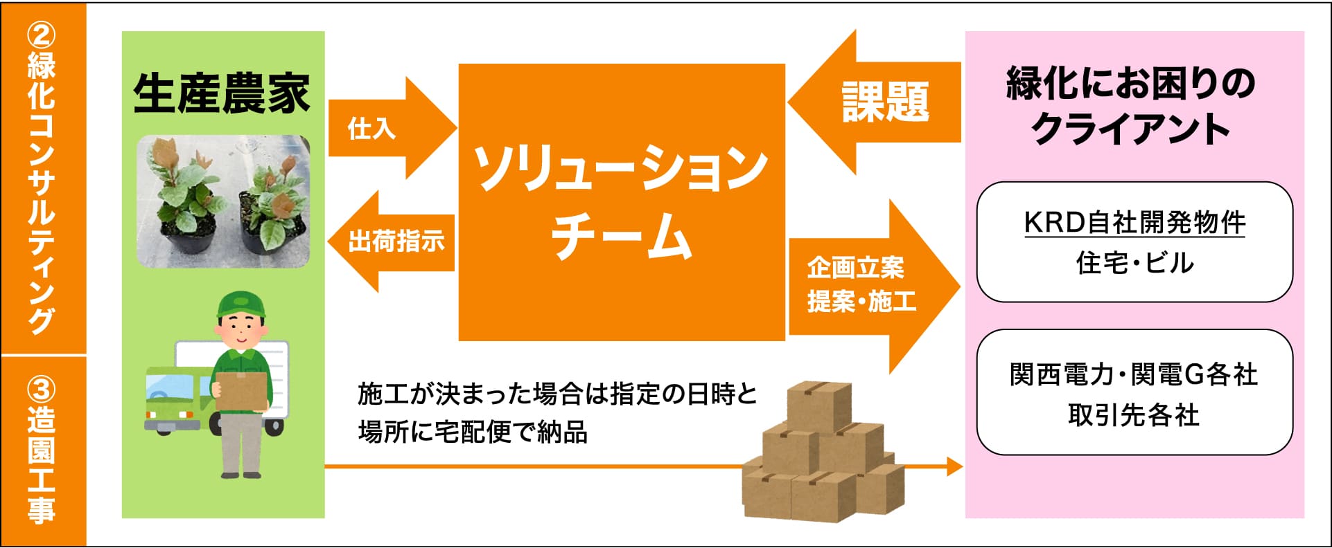 ②緑化コンサルティングはB to Cの業務で、採用された際は③造園工事を直接受注して施工します。