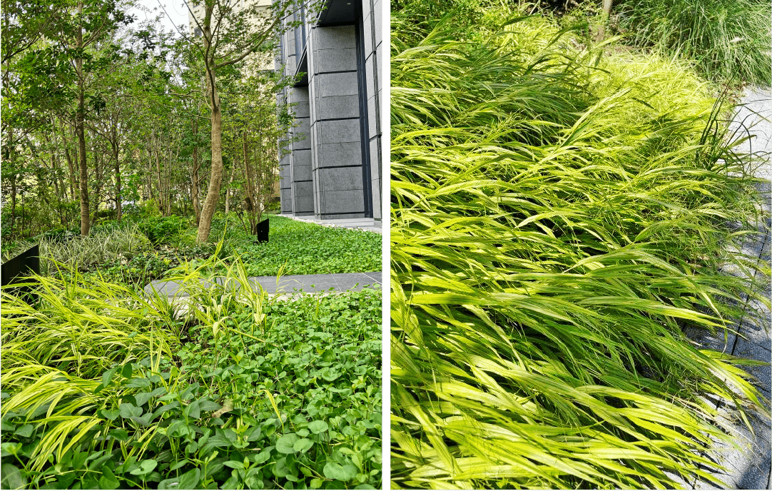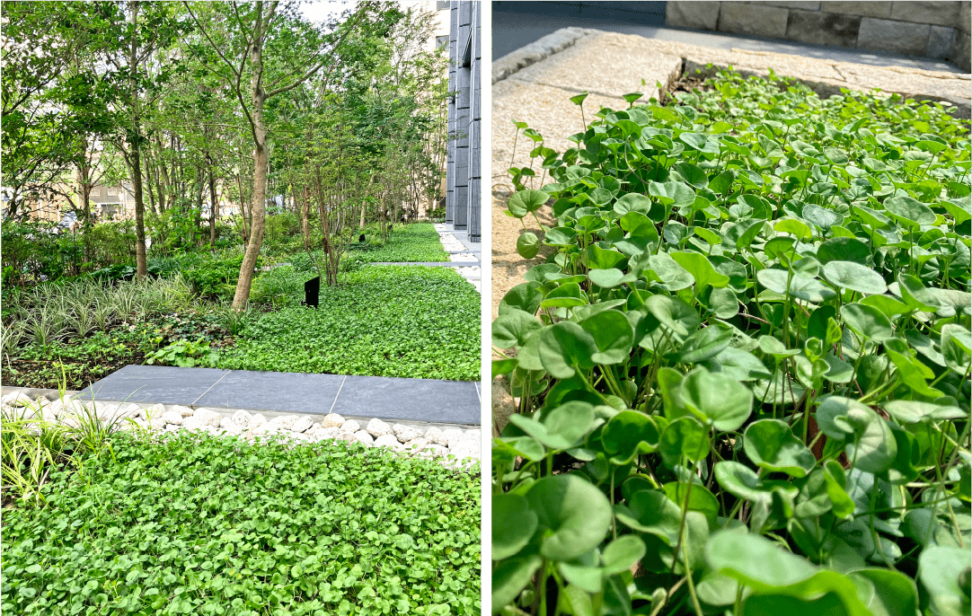 本物件の地面を覆いつくすように植わっているのが2,000potものディコンドラ。乾燥した日当たりを好むので、この猛暑でも青々と茂って美しいです。