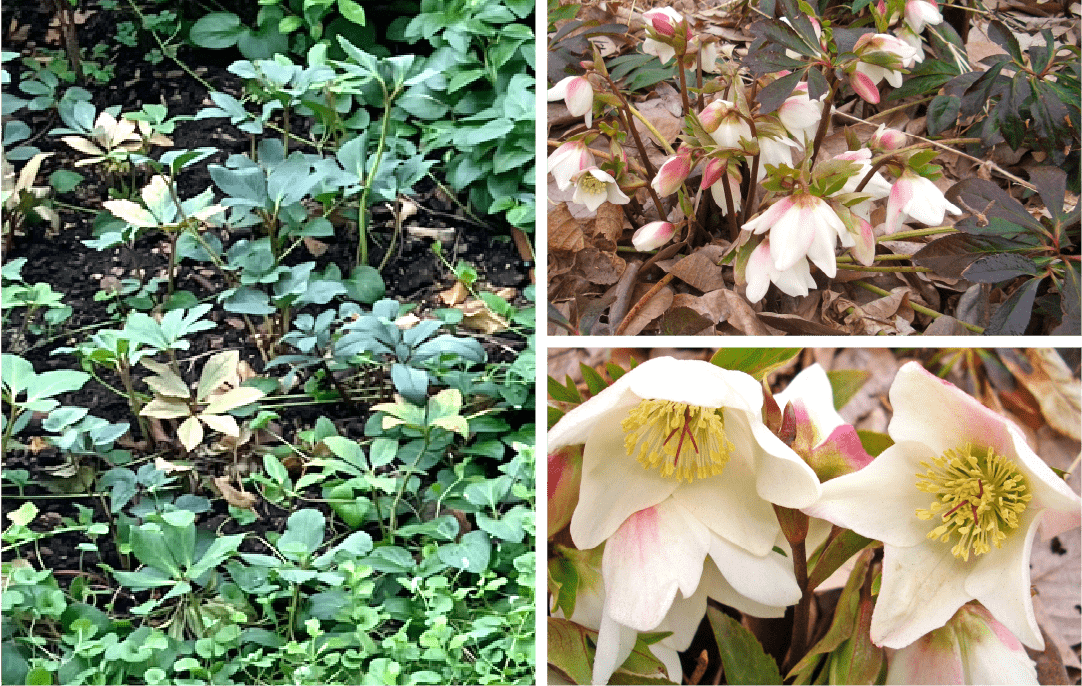 造園工事で使われているクリスマスローズの大半が2~3月の早春に開花する種類ですが、ここに植えられているニゲル種は本当にクリスマス時期に花をつける珍しい原種です。その可憐さから「冬の貴婦人」と呼ばれることも!