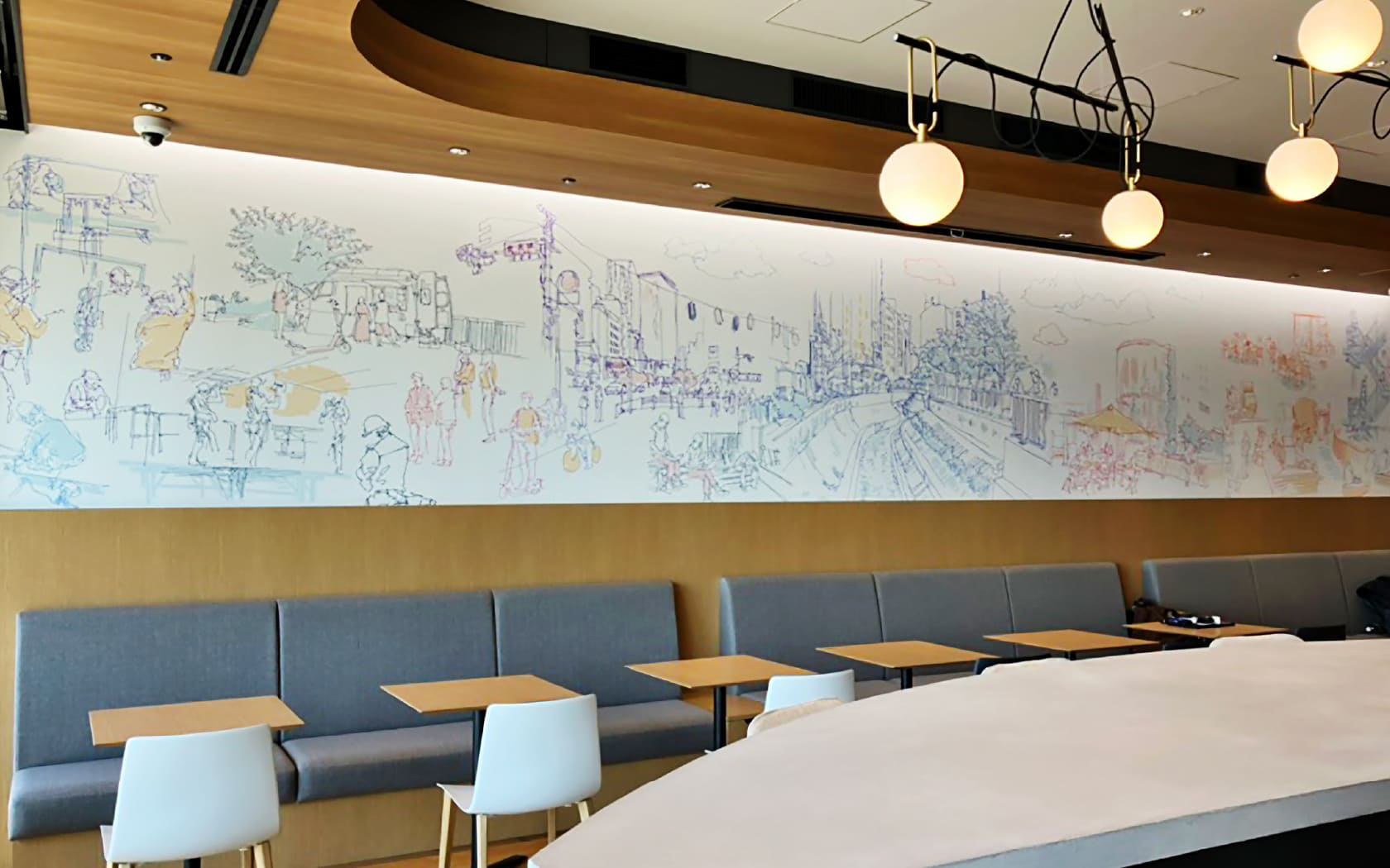 アーティストMariya Suzukiさんに渋谷3丁目の街並みを描いていただきました。「Sora Lounge」とかけてマジックアワー※の色で着色していただきました。アートがコミュニケーションのきっかけや日々の気づきにつながると嬉しいです。