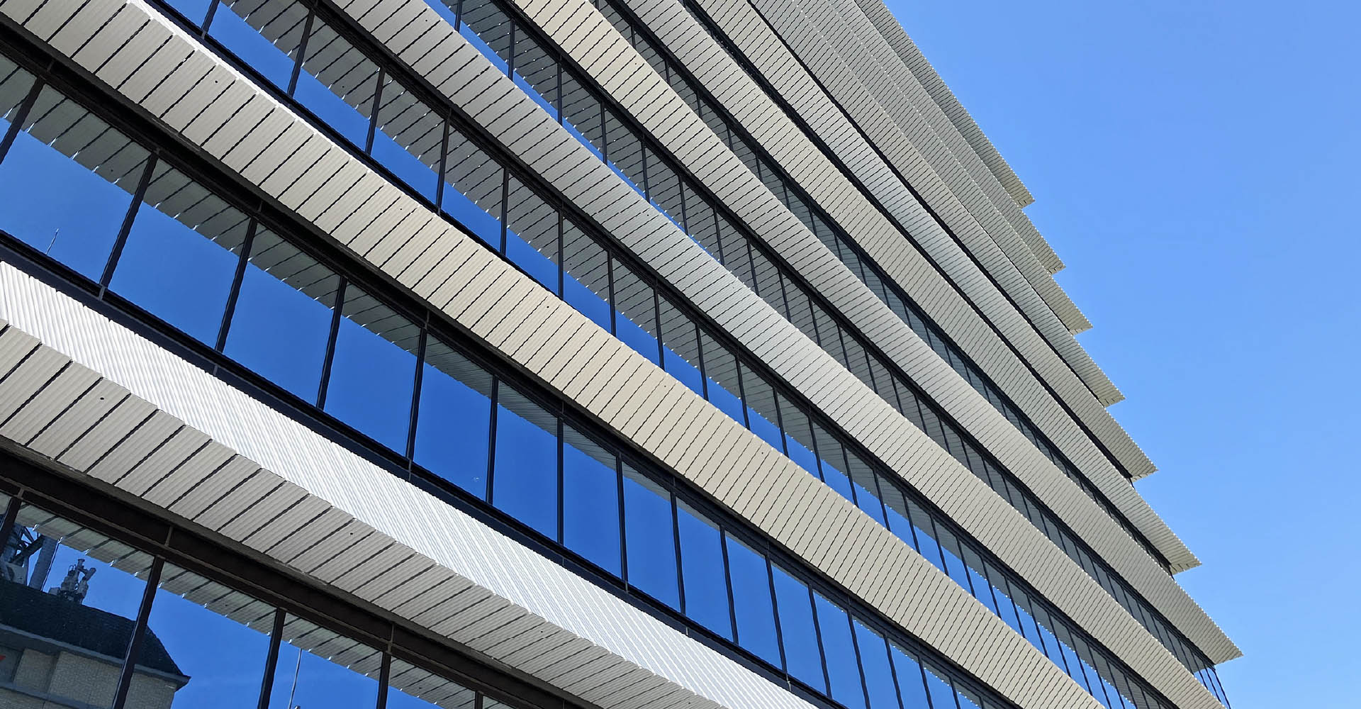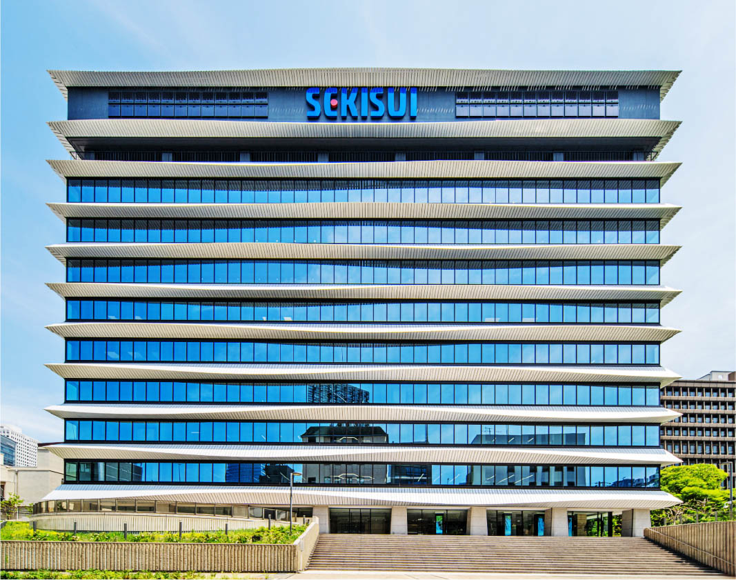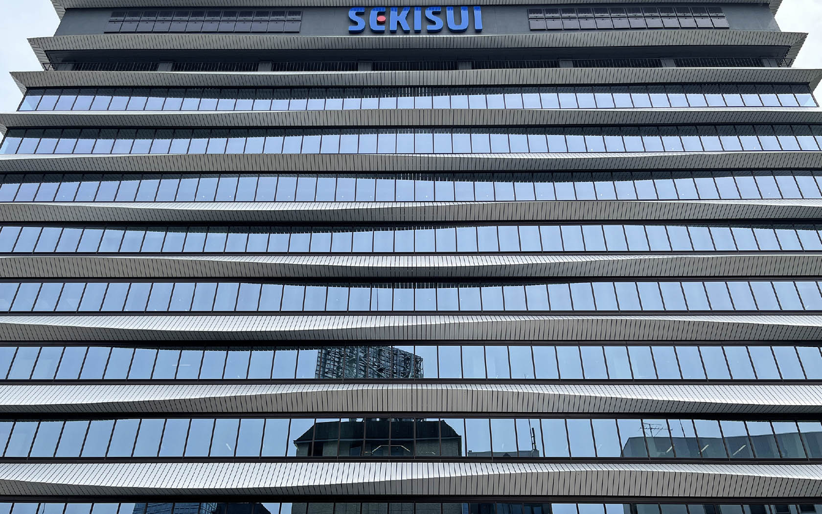 外装材は積水化学工業様の社名の由来である「勝てる態勢(満々とたたえた積水)」をアルミルーバーにより水のモチーフを積層させて表現しています。アルミルーバーは意匠性だけでなく、庇効果による日射の遮蔽を図り、空調負荷削減に寄与しています。