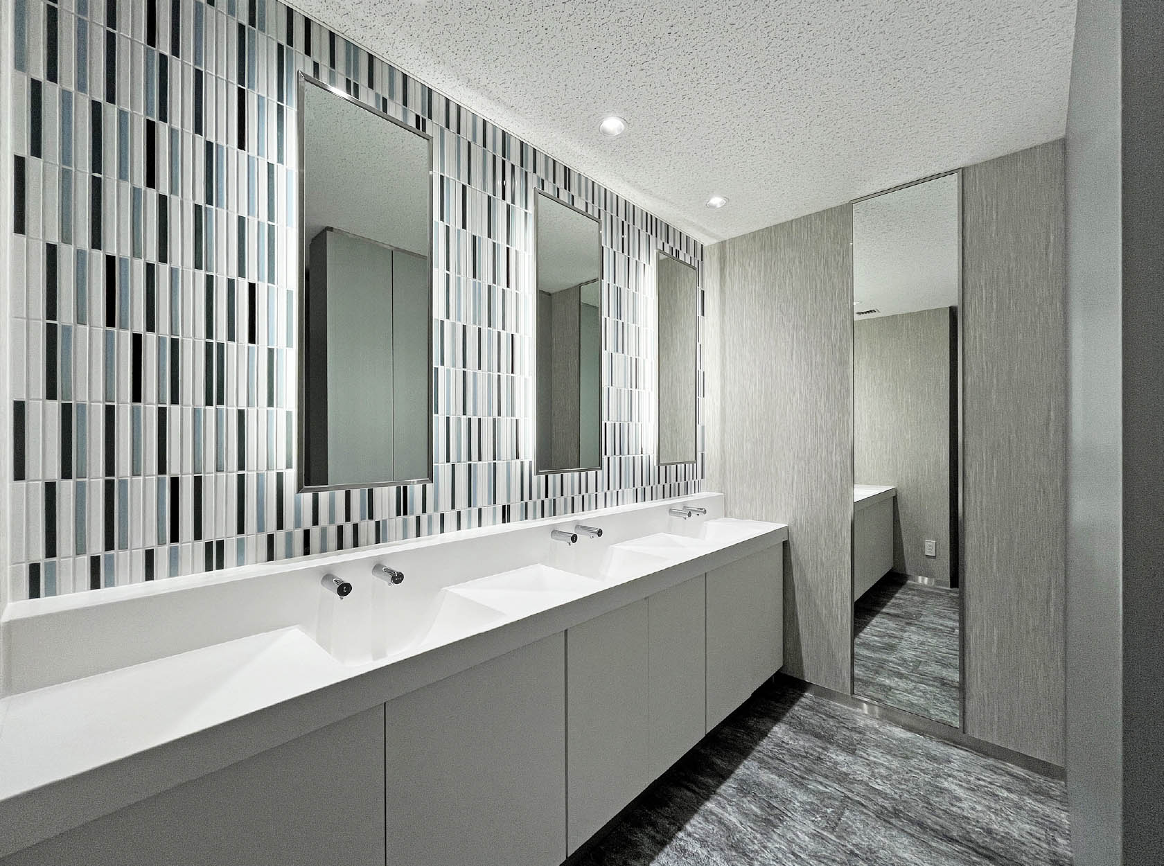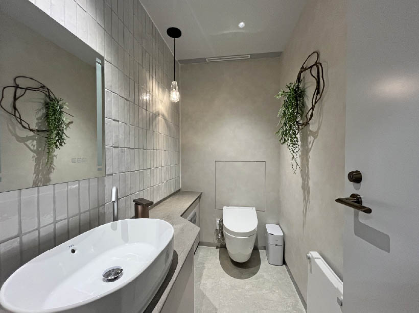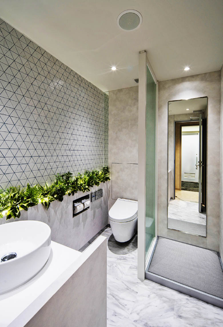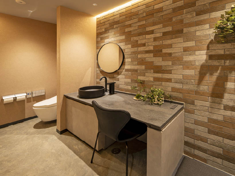 意匠や衛生器具を含め、年数を感じるトイレ空間を清潔感あふれる現代的な空間へと一新しました。2階には社内外の方も性別問わず利用可能なトイレとして「気分やタイミングに応じて自由な個室を選ぶ」というコンセプトを基に3つの個室トイレ(誰でもトイレ)を整備しました。個室内は照明温度と内装空間を揃えることにより統一感を感じ、リラックスできる快適な空間になるよう設計しています。