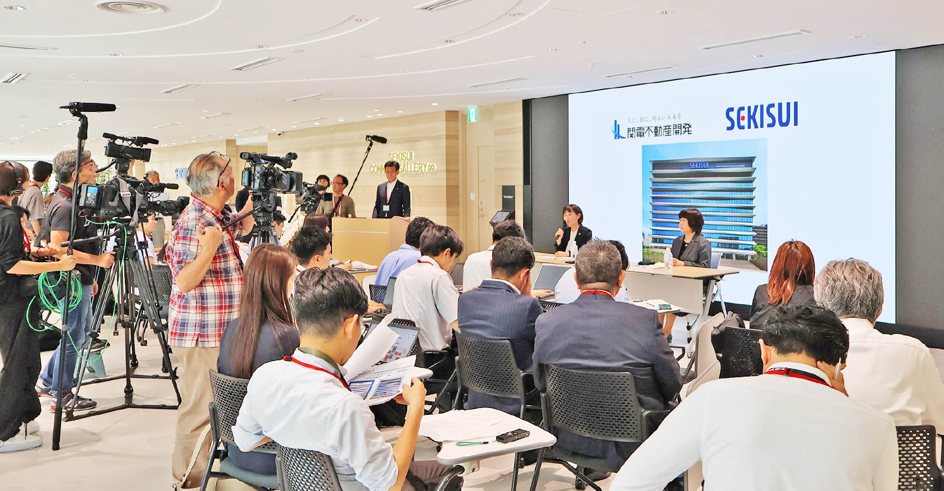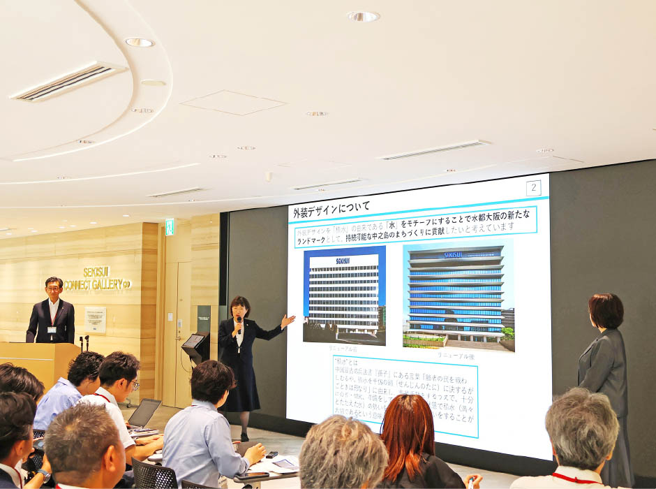 6月30日(月)、福本社長が出席し、堂島関電ビル内において積水化学工業様と合同でリニューアル工事竣工に関する記者発表会を実施しました。当日は多くのメディアの方に参加いただき、ビル内の見学を含め本プロジェクトについてアピールすることができました。