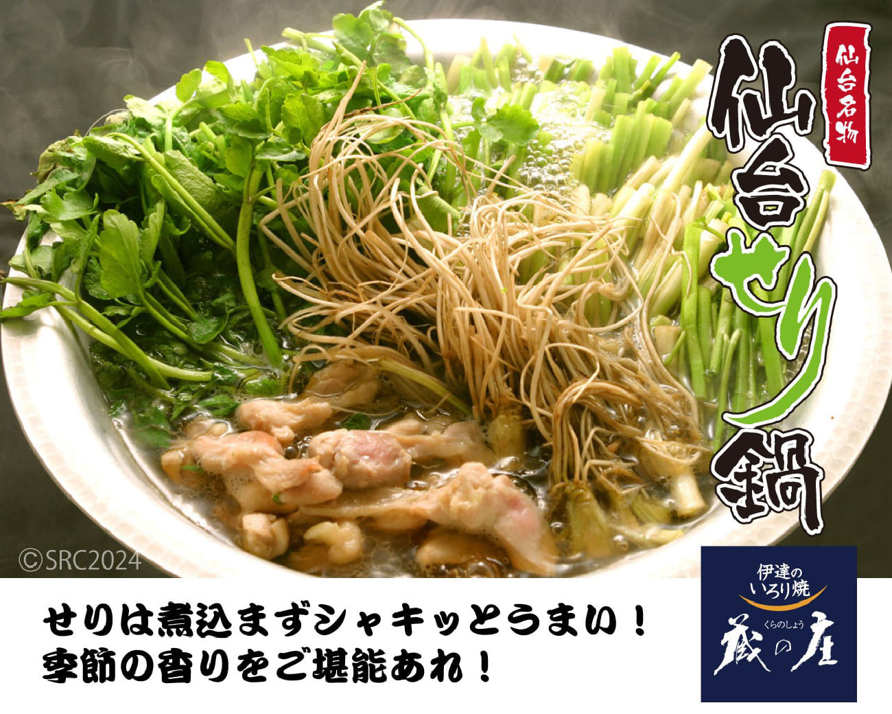 主にせりの根っこを食べるので、最初は抵抗感がありますが、鍋でサッとしゃぶしゃぶして食べると、そのしゃきしゃき感がクセになり、口のなかに広がるせりの香りがたまりません。仙台にお越しの際は、せり鍋を食べてみてください!