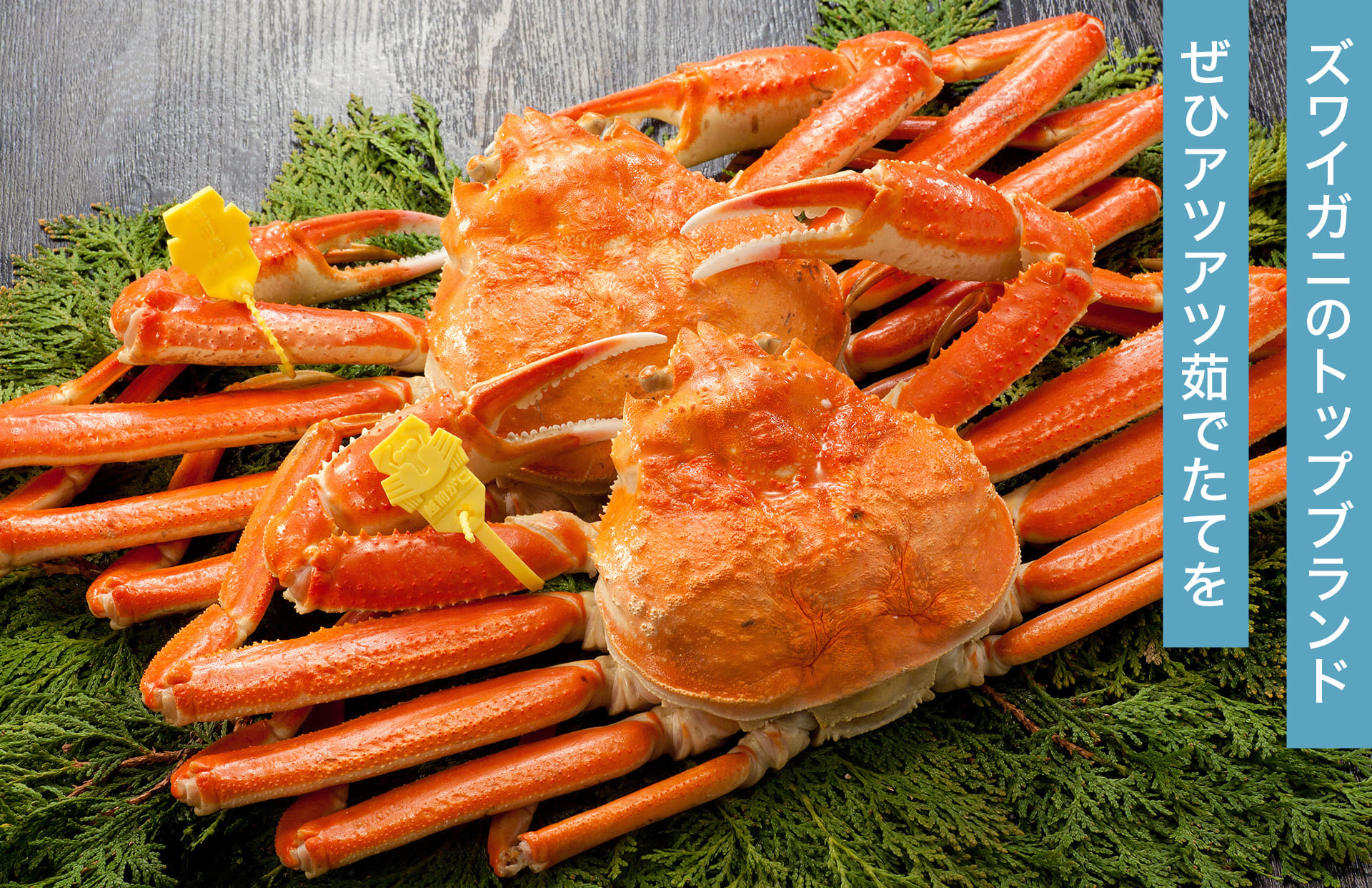 黄色のタグが目印の「越前がに」は、茹で、焼き、鍋、刺身など食べ方はいろいろですが、地元でしか味わえない「獲れたて、茹でたて」は絶品です。また、「せいこがに」と呼ばれる小さなメス蟹は濃厚なかに味噌、朱色の内子とぷちぷちとした食感の外子がたっぷり入った贅沢な一品です!